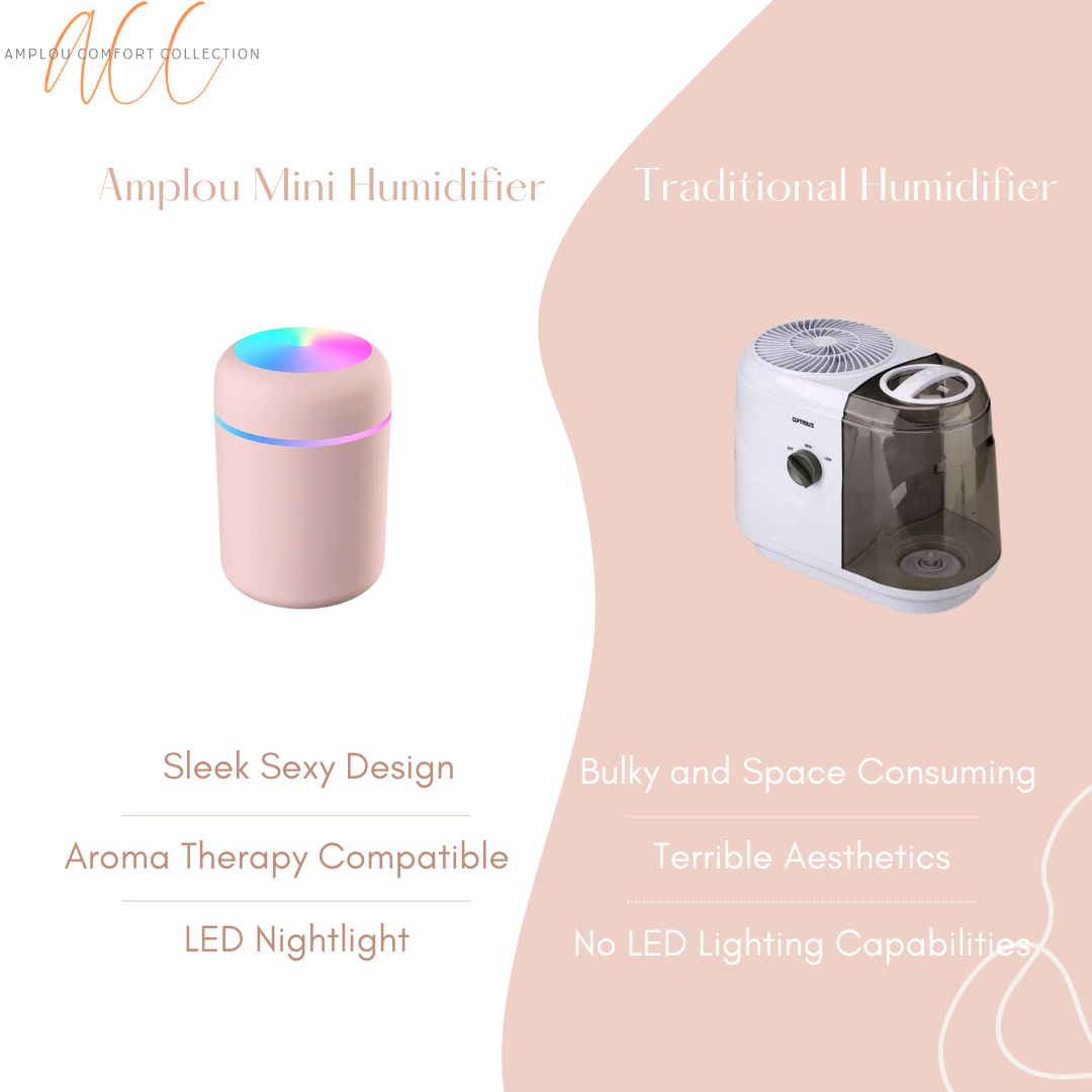 The Amplou Mini Humidifier® boasts a sleek and modern design, adding a touch of sophistication to any space. Its compact size makes it an unobtrusive yet stylish accessory that complements a variety of interior aesthetics. Whether you want to accent a room with your favorite scent or keep a beautiful nightlight on your nightstand, the Amplou Mini Humidifier® brings them both together in an innovative and compact package.